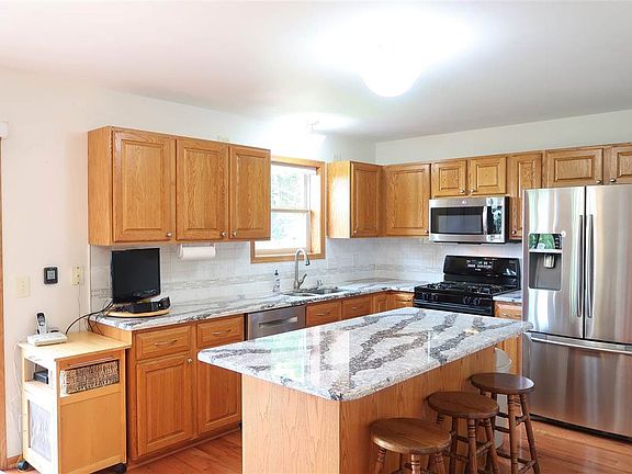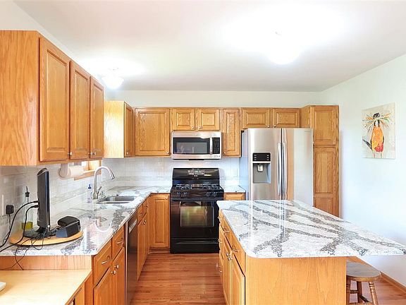 Well maintained 5 bdrm, 3.5 bath, 2500+ sq. ft home on a dead end w/adjacent greenspace & convenient location. Open concept main level features kitchen w/stainless appliances, hardwood floors & quartz tops leading into dining & living room areas w/fireplace & custom stone surround. There's a large deck off the dining room w/great views & access to the professionally landscaped yard. Upper level has laundry, 2nd bath & master suite w/walk in closet & private bath. Walkout lower level has 5th bdrm, full bath, rec rm, storage rm & patio area. Handy 3-4 car garage including a heated & cooled 30' 3rd bay w/a 9x9 door & 20amp 220v elec.