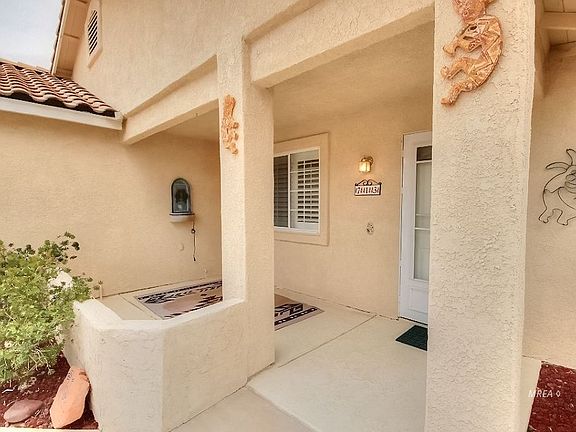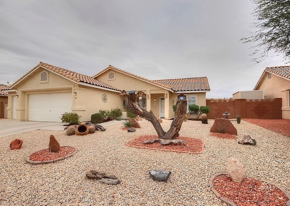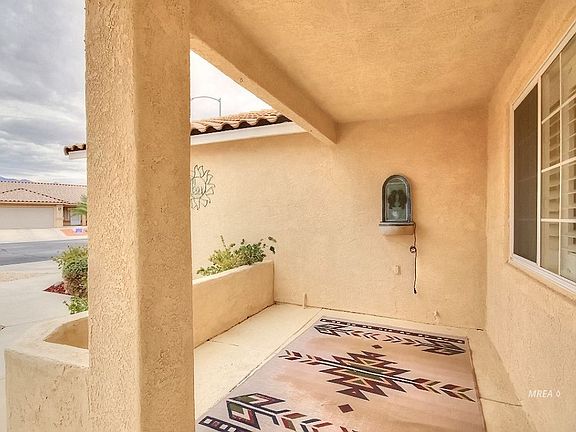 No Homeowner Association Dues! This Desert Rose home is tucked away at the far end of the community on a .17 acre lot. The home has a three car garage, a storage shed and room on one side for toys. The patio runs the width of the home and the desert landscaping is low maintenance. This home's backyard is fully fenced and the home site is within close proximity to restaurants, shopping, golf courses and casinos. This 1431SF home has carpet, tile and vinyl flooring, plantation shutters, walk in closet, ceiling fans and vaulted ceilings. The floor plan is appealing in that you have a living room and a family room, a den, 2 bedrooms, 2 bathrooms, a kitchen, a laundry room, and a dining area/breakfast nook. All the appliances are to remain with the home. The dining area/breakfast nook has a bay window providing a lot of natural light. The front porch looks south and from it's front courtyard, has a view of the mountains. This home is a must see!