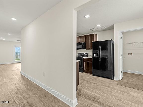 Upon entering, off to the left is the dining room and off to the right you'll enter the kitchen, which features all black appliances and laminate countertops. A separate laundry area is conveniently located just off the kitchen— tucked away where you can also enter from the garage.