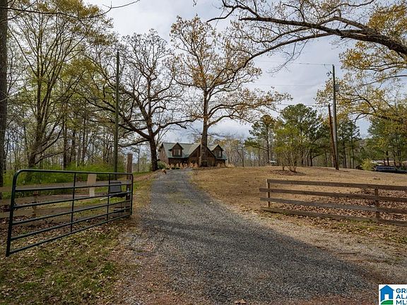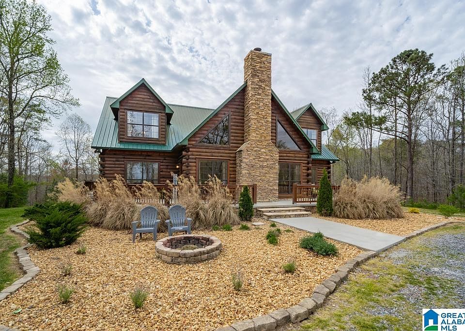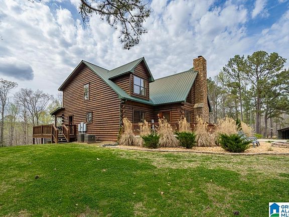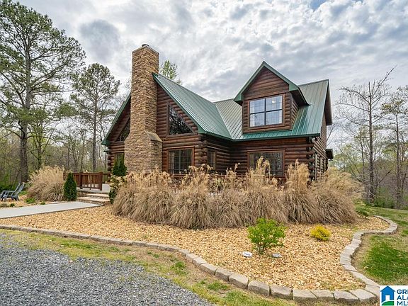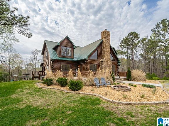 Surround yourself w/17 acres of nature & wildlife as you wake up every morning in your log cabin home feeling like you are on a forever vacation but only 30 min from Bham. Drive thru the gate, right to the front door of this unique & beautifully landscaped property! Step up on the front porch & enter into a huge living room w/a 23' vaulted ceiling & tall wood burning F/P covered in rock! The kitchen has an island w/eating bar, fabulous STONE, dbl oven, tons of cabinets, & breakfast area! Laundry room is off of the kitchen & has a side door to the wrap around back deck overlooking the huge yard! Primary suite has a dbl vanity, walk-in shower. There is also a 2nd BR on the main, w/a full bath! Upstairs features a balcony, & BR's 3 & 4 that are massive w/walk-in closets & a shared full bath! Daylight finished basement w/a spacious den, pool table area & 2nd F/P, BR 5, full bath, bonus room, & a 1 car garage, workshop, & storage area! Also included on the property is a 30x50 pole barn.