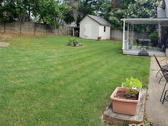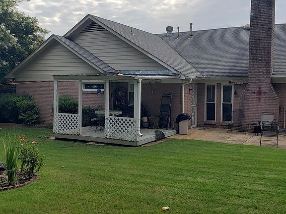 Nice 3 bedroom, 2 bath brick home. The large primary bedroom has a private bath with 2 vanities, knee space, whirlpool tub, shower with 2 heads & a walk-in closet. Solid surface floors except in 2 bedrooms. A breakfast bar separates the kitchen and dining area. The great room has a gas fireplace & ample room for large furniture. Windows are new. Ceiling fans in most rooms. Double garage has doored storage closet and pull-down stairs. Patio and a covered deck overlook a manicured backyard. A storage shed remains. Privacy fenced backyard.