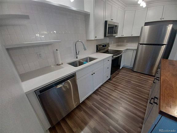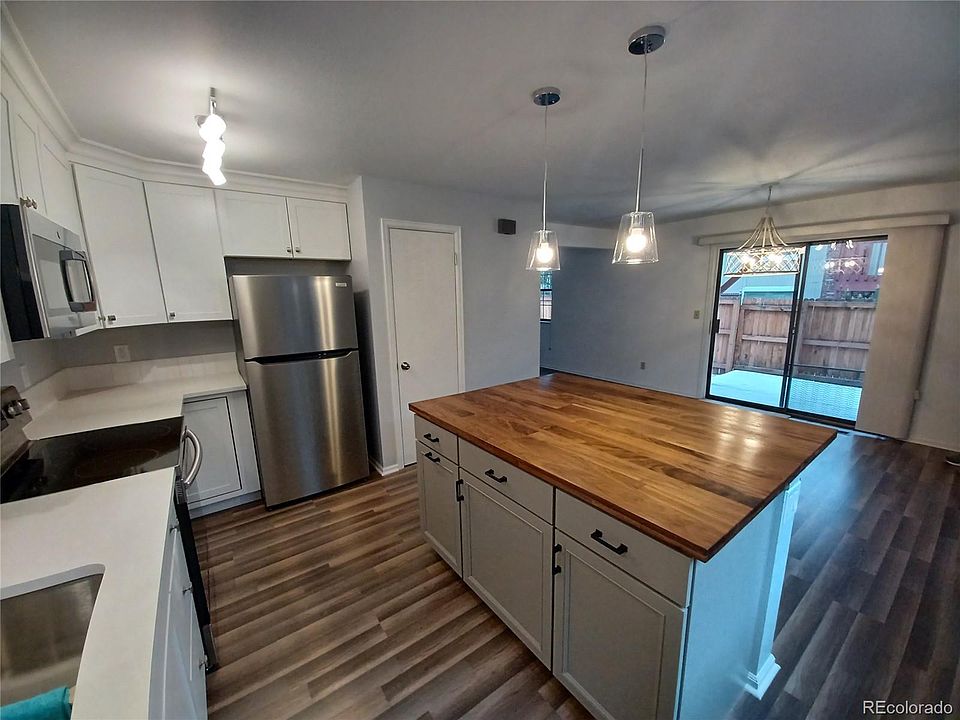 Welcome to your dream townhome in Littleton! This recently remodeled 3 bed, 3 bath home boasts a modern and sleek design. The kitchen truly shines as the heart of the home, featuring a large island with a gorgeous walnut countertop, newer stainless steel appliances, and a host of new features including the sink, faucet, backsplash, lighting, and cabinets. The remaining countertops in the kitchen are quartz, adding to the luxurious feel. The eat-in kitchen provides sliding door access to the enclosed patio. Cozy up by the fireplace in the living room, perfect for relaxing on cool evenings. The main level also offers the convenience of a laundry room and an updated half bath. Upstairs, you'll find the primary suite, complete with a spacious closet, an updated 3/4 bath, and a balcony that adds a touch of outdoor charm. Two additional bedrooms and an updated full bath are also located on the upper level. The upper level has new carpet throughout, and waterproof laminate in the bathrooms. The basement has been partially finished, providing a comfortable family room for additional living space. The other half of the basement is ideal for storage, keeping your belongings organized and easily accessible. This great townhome also includes a 2-car detached garage, ensuring ample parking and storage options. With a fantastic location, you'll enjoy easy access to Columbine West Park/Pool, the 470 highway, a variety of restaurants, shopping destinations, and a short drive to Chatfield State Park, offering abundant outdoor recreational opportunities. Don't miss out on this incredible opportunity to make this townhome your own. Schedule a showing today and seize the chance to own a beautifully remodeled home in an excellent location in Littleton!