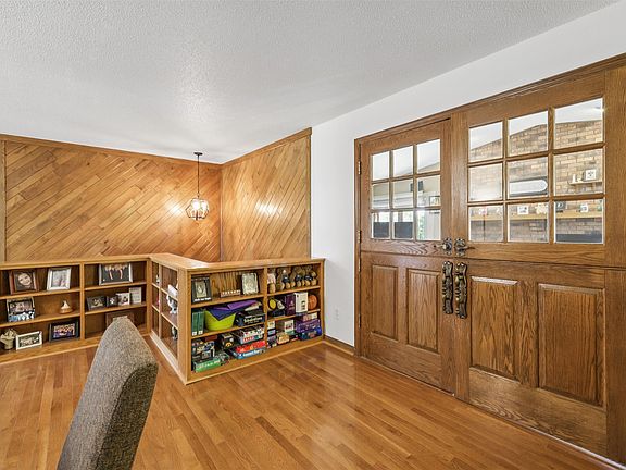 countertops, abundant cabinetry, and overlooks the land. A formal dining room with hardwood floors
