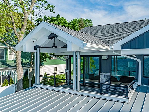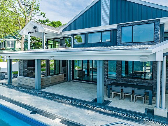 Luxury lake living at its finest! Say hello to this ultra modern, ultra chic home w/ multiple living spaces, infinity pool & 100 feet of frontage on beautiful Lake Wawasee PLUS guest house, barn & outdoor basketball court across street! Located on the north side of all-sports lake, this 2-story, 6 bedroom, 5 full bath, 2 half bath is an entertainer’s dream w/ plenty of room for all your friends & family, either as a full time residence or ultimate getaway. You would never guess the main house was built in 1983 as it has been completely updated & modernized from inside out—including heated driveway, Control4 system throughout, automated shades, Miele & Wolf appliances & phantom screens. Nestled on 0.58 elevated acres offering breathtaking views, outdoor space has been perfected w/ professional landscaping, easy maintenance astro turf yard & tiered rock gardens surrounding the 5 outdoor fire pits, waterfall, in-ground pool (w/ outdoor shower) & covered outdoor kitchen. From the moment you arrive, you’re sure to fall in love w/ the exceptional quality, detail & custom craftsmanship adding unparalleled ambiance w/ modern lighting elements, luxury materials, 3D wall textures & of course, fantastic waterfront views from 3 sets of glass doors that open all the way up lakeside. Open concept main living area is bright & welcoming w/ formal dining beside kitchen featuring large central island w/ seating. Extra long living room can be divided into 2 seating areas w/ wall of stone gas fireplace on one & more casual hangout around full bar w/ wine & beverage fridge on other. Main floor bedroom w/ en suite; lower level has 2 bedrooms, home theater & full bath. 3 more bedrooms upstairs—all w/ en suite baths. Luxurious primary bedroom features wrap-around views, private 2nd floor covered balcony, soaking tub, double sink vanity, walk-in shower & generous walk-in closet w/ built-ins & seating. Relax in comfort by outdoor fireplace w/ TV next to outdoor dining & kitchen—all covered w/ ceiling fans to keep air flowing. 2-story guest house across street on 0.63 acres has 3 bedrooms, 2.5 baths, updated cabinets, paint & flooring. 30x40 barn has heat/air & room for RV, boat storage etc in addition to attached 4 car garage on main house. Basketball court backs up to railroad tracks w/ private, partially fenced yard next to barn. Ideal location on walking trail just down from Wawasee Golf Club w/ easy access to marinas, shopping, dining, groceries, even boat-in waterfront dining!