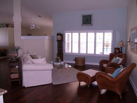 Great opportunity to live in gated Lakeview Estates Community. No zero lot line and low HOA dues. Lovely 4 bedroom; 2 bath; 2 car garage single family home located in a culdesac -lake lot with an oversized built in heated swimming pool and jacuzzi. Salt water pool system keeps chemical costs down and maintenance easy. Designer painted driveway leads to front entry way with double doors and screened enclosure. Open floor plan with vaulted ceilings - the interior boasts of Brazilian Walnut flooring in formal living and dining areas. Windows include beautiful plantation shutters and blinds. Kitchen has been upgraded with granite counter tops and tumbled marble backsplash. Lush landscaping and rear covered patio with pool is great for entertaining and outdoor BBQ's! Secure fenced back yard; hurricane shutters; plus new American Standard top of the line a/c system are just some of the extras. A must see! Lakeview Estates is centrally located near "A" rated schools (Coral Reef Elementary; Woodlands Middle; Park Vista High), shopping, dining, and major highways. Freshly painted and well maintained this home is waiting for you!
