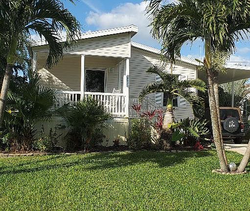OWN THE LAND.This beautiful move in ready home can be yours.Enjoy the cool Ocean breezes from your front porch,while having your morning coffee.This spacious 2 bedroom, 2 bath ,was built in 2007, to Wind Zone 3 specs.A new roof in 2016 and complete storm panels make this house worry free. Pride in ownership shows in this well maintained unit.The house sits up high, so the breezes from the Intercoastal and Ocean add to the enjoyment of the porch. New (2019) carpet in the guestroom, and the laminate floor insure easy care and time for relaxation. Minutes from the Hobe Sound/Jupiter Island Beaches, Jimmy Graham boat ramp, restaurants, shopping,and Medical care, make this a great location. Pets welcome, voluntary HOA. Labradoodle does NOT CONVEY.