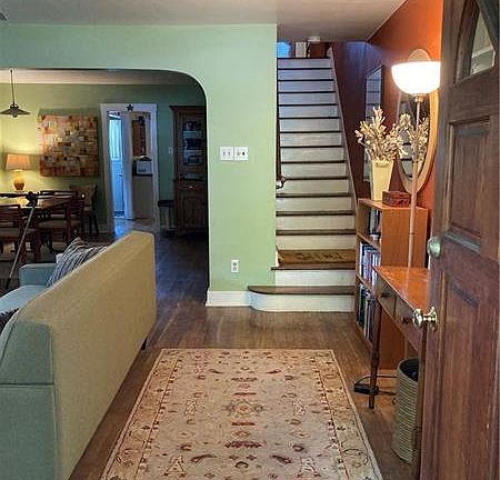 Spread out in this charming and spacious Point Breeze home featuring a shady landscaped yard, lots of living space, and updated features. Enjoy the outdoor living spaces offered by the front porch, framed with brick arches, and the rear deck off the kitchen. An office nook and half bath adjoin the kitchen, and the dining room and living room are also on the first floor. Three bedrooms and one full bath complete the second floor, and the third floor offers a very large room with its own full bath. The tidy and dry basement holds laundry facilities (complete with a laundry chute from the upper floors) and ample space for a workshop or crafting. The garage has beautiful doors to the back yard, and the naturalist in you will appreciate the interesting trees and perennials surrounding the house.