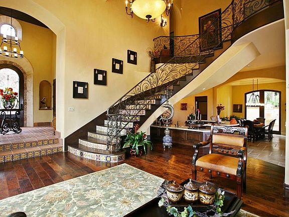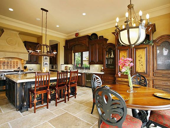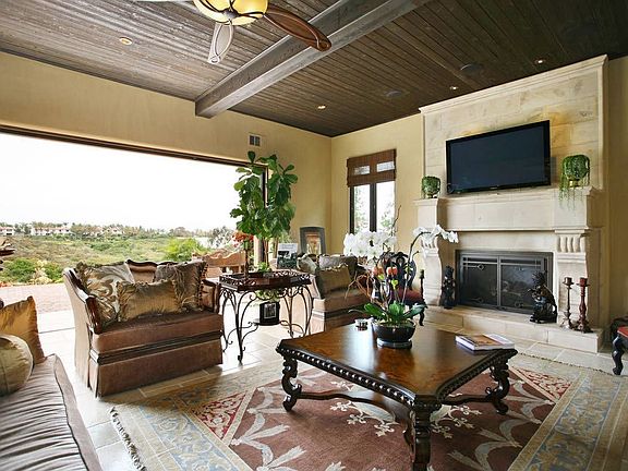 Enjoy remarkable golf course views from nearly every room in this gorgeous Santa Barbara style home designed by architect Murray Duncan, located in the quiet, gated, custom home community of Aviara Point. Incredible detail abounds in this elegantly designed 5 bedroom, 5 bath, 5,700 square foot masterpiece built in 2008. A combination of beautiful wood and stone floors, stone baseboards, America Clay plaster wall treatments and hand painted tiles are used throughout. The great room, with wet bar, spectacular golf course views, wood burning fireplace and a 20’ wide sliding pocket door, opens to a fabulous outdoor entertaining area that includes a fire pit and barbeque. The gourmet kitchen, with custom cabinetry, Bosch and Dacor appliances, reverse osmosis system and home water filtration system, walk-in pantry and butler’s pantry, adjoins an open breakfast area with beautiful golf course views. Downstairs, a state-of-the-art media room with complete surround sound can be converted to a 6th bedroom. The winding, suspended staircase with wood planks, hand painted tiles and a wrought iron railing leads to the second story that is complete with a spacious master bedroom, four additional bedrooms and a sizeable laundry room. The master bedroom, with large picture windows, a charming balcony and panoramic fairway views, features a fireplace, a luxurious bath with Onyx stone accents, bronze fixtures, a BanUltra bathtub, a Rainbath steam shower and a walk-in closet with stylish built-ins. Auxiliary en-suite bedrooms include custom tiled baths, walk-in closets with built-ins and flat screen televisions. Other features include a State-of-the-Art Home Automation system including a 96” wide screen and 8 additional flat screen TVs, copper gutters, a completely finished 3 car garage and lush landscaping. Rarely can one find such an exquisitely detailed, quality and newly built home that's located near the beach at such an incredible value.