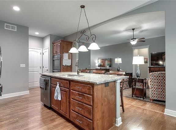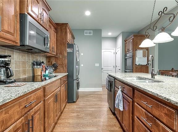 The Sierra by Hoffman Custom Homes is a beautiful reverse 1.5 story home. This spacious home has hardwoods on the main level except in office & master bedroom. Main living area boasts 9-10 ft ceilings. Bonus office or possible 4th bedroom. Kitchen features a huge island, pantry and a double oven. Laundry room just off the kitchen area. Dining room walks out to a wood deck with a pergola. There are 2 large bedrooms in the basement and a 16 x 17 family room. LED lights in the kitchen and master bathroom. All the metal shelves will stay in the basement storage area and also the black refrigerator. Custom blinds throughout the home. Wooden fence and sprinkler system