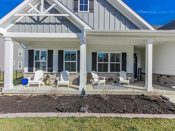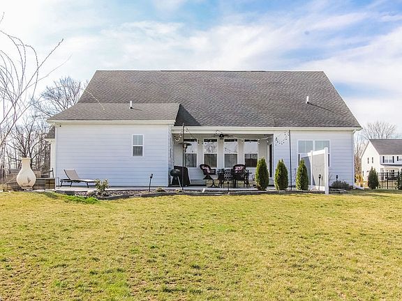 Gorgeous, New Palestine Ranch in Noelting Estates. Built in 2021, this spacious home has a full finished basement in a private suburban neighborhood on quiet cul-de-sac. This home features a spacious great room with open concept floor plan; huge gourmet kitchen with stainless steel appliances, granite island and counter tops, dining room overlooks large, covered patio for those family cook outs on this 1/2-acre corner lot. 3 main bedrooms, include the luxurious master, with large ensuite and walk in closet, with access to the rear porch; and two guest bedrooms on the opposite side of the home, for the kiddos or guests. In the basement, there is a 4th bedroom, and full bathroom, large recreational room/space for all of those parties and football games! Owners are leaving an impressive, security camera system already wired in (in basement set up) for the home. Exterior is a beautiful stone and hardiplank siding. This home is a must see!!