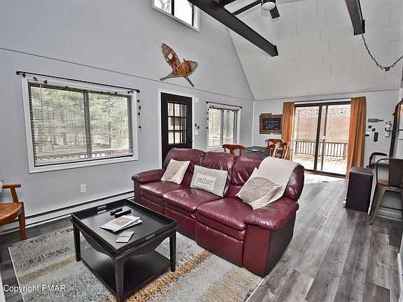 TURNKEY 4bd/2ba Contemporary Chalet in the HEART of an AMENITY-FILLED STR community. The BRIGHT/AIRY OPEN LAYOUT connects the Living Room, Dining Area, & a BEAUTIFUL Kitchen. Imagine preparing meals in a space w/ soft-close drawers, an island, granite backsplash, & a deep farm sink. 2 SPACIOUS bds & bath on each floor. Step outside onto the EXPANSIVE wrap-around deck to soak in the tranquil surroundings or gather around the fire for cozy evenings under the stars. For ultimate relaxation, indulge in the HOT TUB. The detached 2-car garage has plenty of room for your outdoor gear & vehicles. The community amenities, including lakes, beaches, tennis courts, & more. Take a short stroll to one of the community pools, or venture out to explore popular Pocono attractions just moments away. Whether you're seeking a peaceful retreat or an adventurous escape, this FULLY FURNISHED home offers the perfect blend of comfort, convenience, & natural beauty. Don't miss this opportunity!