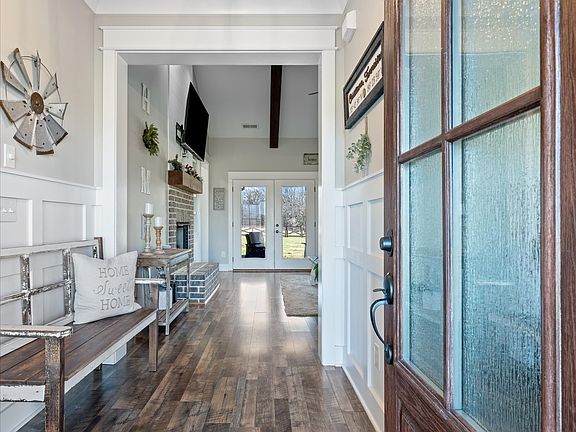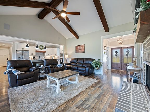 Motivated seller! $10,000 offered towards rate buy down or buyer closing costs. Discover the charm of country living in this beautiful custom-built home set on 6 peaceful acres. From the moment you step inside, you’ll feel the inviting, homey warmth created by handcrafted details and thoughtful design throughout. Gorgeous wood beams, tongue-and-groove porch ceilings, cedar accents, wainscoting, plantation shutters, and a charming brick fireplace add timeless character, while large windows fill the home with natural light. The custom kitchen offers both style and function, and the tiled showers bring a touch of luxury to the everyday. Built-in ceiling speakers elevate your entertainment experience. Enjoy the privacy of country life with no city taxes, yet benefit from easy interstate access for convenient commuting. Outdoors, you’ll find a brand-new fenced backyard, a new hot tub, and a useful storage building perfect for hobbies, equipment, or extra space. This one-of-a-kind property blends comfort, craftsmanship, and modern amenities. A must-see for anyone looking for space, charm, and the best of country living.