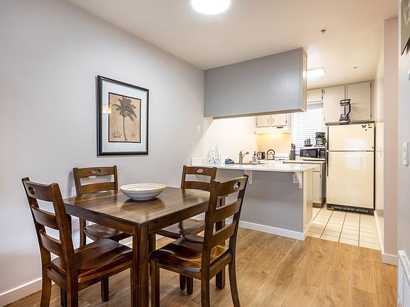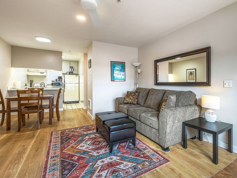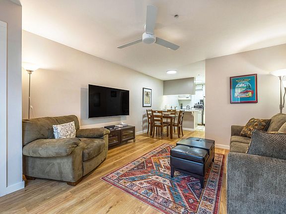 Feel at home in Hood River, Oregon, with this charming 1-bedroom, 2-bathroom Lodge 15 apartment. Perfectly accommodating up to 2 guests, this multi-level residence offers stunning river views and is ideally situated for leisurely strolls to local shops, restaurants, and the famous Saturday Market. The pale blue facade of the apartment contrasts beautifully with the surrounding towering trees and sparkling waters, providing a serene retreat. The spacious living room invites relaxation with its cozy couch and plush armchairs, all centered around a large flat-screen television for entertainment. The living room seamlessly connects to a fully equipped kitchen, complete with ample counter space, modern appliances, and all necessary utensils and cooking accessories. A dining table for three elegantly bridges the kitchen and living room areas. The vibrant bedroom, adorned with orange and yellow walls, offers a private oasis with an attached bathroom featuring a standing shower and tub, as well as private access to an extended deck. The apartment is equipped with air conditioning for your comfort. Coin-operated washers and dryers are conveniently located at the end of the condo building next to the unit. Nestled in the heart of Hood River, this apartment provides easy access to the stunning Columbia River Gorge and a plethora of outdoor adventures. With forests, mountains, lakes, and waterfalls just outside your door, endless opportunities for exploration and discovery await. The apartment's location also offers convenient off-street parking and gear storage, making it an ideal base for your adventures. Check-in and check-out times are flexible to accommodate your travel plans. The apartment maintains a no-smoking policy to ensure a pleasant environment for all guests.