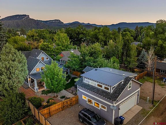 Welcome to this beautifully designed Craftsman-style home located in the heart of downtown Durango. Custom-built by Kogan Builders, Inc., with architect Christopher Dale, this stunning residence, completed in 2015, combines classic craftsmanship with contemporary luxury. Situated on a spacious double lot in one of Durango’s most desirable neighborhoods, the home offers both privacy and elegance. A charming black metal picket fence encloses the front yard and the covered front porch, welcoming you as you enter the home. You’ll be struck by the attention to detail and craftsmanship. The main floor showcases hand-crafted woodwork fashioned from 100+ year old wood reclaimed from the original property, and distressed, wide-plank hickory hardwood floors. The office is beautifully appointed with custom built-ins, including a large desk and bookcases. The spacious living room features a large Lennox gas fireplace framed by lighted displays, with vaulted ceilings and oversized eaves adding to the open, airy feel. Natural light streams in through large skylights on both floors, creating a warm and inviting atmosphere. The chef’s kitchen is a dream, equipped with Cambria quartz countertops, attractive cabinetry, and top-of-the-line appliances, including a Viking dual fuel range, GE Monogram microwave/oven with Advantium Speedcook, and a GE side-by-side refrigerator. A spacious island provides ample room for meal prep and entertaining. Adjacent to the kitchen is the dining room, which is highlighted by a stunning Ulla-Darni handcrafted glass chandelier—perfect for meals and gatherings. Custom knotty alder doors and double-hung wooden windows continue the theme of craftsmanship, while oversized eaves and an asphalt shingle roof enhance the home’s durability and aesthetics. The home features a 3-zone forced-air HVAC system with central air conditioning and a custom Axxis audio/video system with speakers throughout the main floor and porches. The main-floor master suite serves as a private retreat, featuring a Quadra-fire gas stove for added warmth and ambiance. The master bath includes a deep Kohler soaking tub, quartz countertops, and a cabinet with a fold-down ironing board for convenience. A custom barn door adds a rustic touch, while the walk-in closet offers ample storage. It’s the perfect place to unwind after a long day. Upstairs, you’ll find two additional bedrooms, a full bathroom, and a cozy sitting area, all connected by a custom hickory stairway and railing. A large skylight illuminates the upper level with natural light, providing comfort and privacy for both family and guests. The landscaped grounds include flower beds crafted from original foundation stones, grassy areas, and well-maintained gardens. Large covered porches at the front and rear provide ideal spaces for outdoor entertaining, with the rear porch plumbed for a gas BBQ. A slate walkway leads through the backyard to a serene garden area, adding charm to the outdoor living space. In addition to the main house, the property includes a spacious two-car garage with extra storage and two additional outside parking spaces. The accessory dwelling unit (ADU) above the garage features a custom barn door, Quadra-fire gas stove, top-of-the-line apartment-sized appliances, and a stacked washer/dryer, making it an ideal guest space or rental unit. The property has been upgraded with new water and sewer lines from the street to both structures, ensuring modern functionality and peace of mind. This home perfectly represents downtown Durango living, blending historic charm with modern amenities in an unbeatable location. Don’t miss this opportunity to experience an extraordinary residence in one of Durango’s most sought-after neighborhoods.