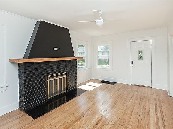The living area boasts a wood-burning fireplace. The heart of this home is the modern kitchen, thoughtfully transformed with new cabinets, countertops, and appliances, offering a chic and functional space.