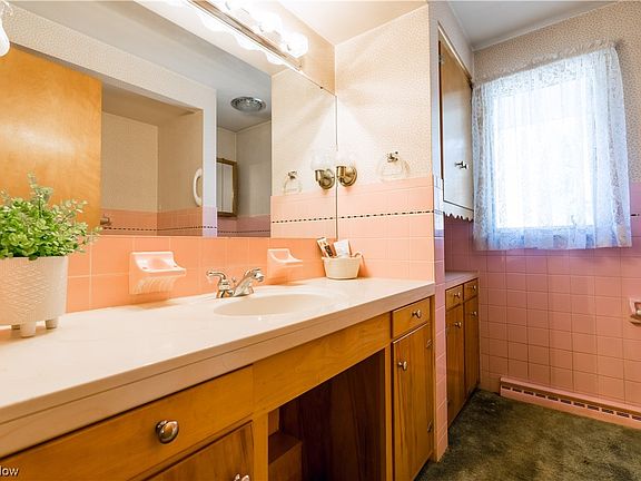 Welcome to this charming 1960 built brick ranch home located in a quaint neighborhood filled with blossoming trees and flowers that will enchant you. You will love the convenience of being close to the University of Mount Union and all that the area has to offer. This one-story living at its finest is perfect for those who appreciate the timeless elegance of the original woodwork throughout the home. Upon entering, you will be greeted by a spacious living area that connects to the cozy dining area with a double sided fireplace. The home features two bedrooms and two full bathrooms, one of which boasts a retro pink bathroom that will take you back in time. The partially finished basement provides additional living space and endless possibilities. Updates to the home within the last 10 years include a furnace and hot water tank, providing peace of mind for years to come. The home also features a large backyard with a concrete patio that is perfect for outdoor entertaining. The lush gras