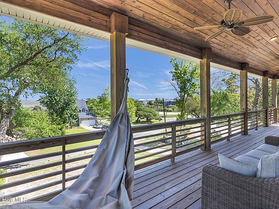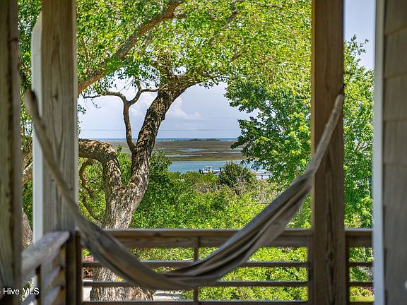 The coastal Carolina dream is awaiting at 714 Hughes Rd. Imagine being greeted by the sunrise and your private long view, spanning the pristine intracoastal waters all the way to the Atlantic Ocean. Close the day with a cocktail and majestic sunsets from your Bali inspired wrap around porch. Privacy- where you'll hear little more than the wind rustling through the mature oak trees and perhaps a passing boat returning from a fishing excursion. This home and expansive lot offer a unique opportunity to live within the sought after Washington Acres community. The property boasts immediate proximity to the coveted anchorages and back beaches of Rich's Inlet, Lea Island and S Topsail Inlet-literally a boaters delight that will not be duplicated easily. Deeded boat ramp and water access is across the street. Built originally in 2018, the coastal modern design captures rustic island charm, all-seasons front porch living and waterway/ocean views. Abundant natural light floods the open living spaces, graced by vaulted ceilings and beautiful rustic milled hickory wood floors meticulously crafted from trees removed while building this home. The thoughtfully designed layout keeps you connected to the water from every room. An elegant coastal kitchen features marble countertops, stainless appliances, bar seating and pantry. The master bedroom offers custom design elements including bamboo roll down shades, inset fireplace for cool evenings, barn doors, custom oak slab vanity top, high end closet system w/under mount lighting and soaking tub with ocean views. The first floor features a bonus/media room, wet bar & beverage fridge, stained concrete floors and an additional bedroom with full bath. This is the perfect spot for entertaining, creating a space unique to your interests or area for kids to spread out and play. Don't miss the oversized, insulated garage with work station and additional storage for all your toys or tools. Permitted options are available to add an additional
