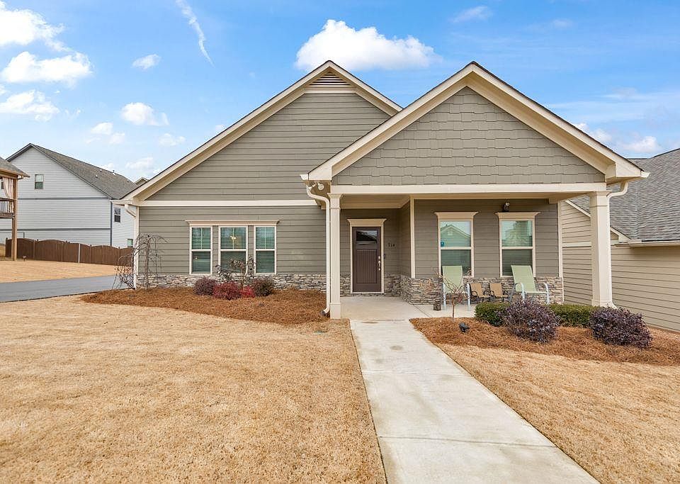 Welcome to this stunning 4 bedroom, 3 bathroom home nestled in the Lantern Walk community. Situated on a corner lot, this residence boasts a welcoming covered front porch, setting the tone for the charm that awaits inside. You'll be captivated by the open concept main floor, creating an inviting and spacious atmosphere. The kitchen is a chef's dream, featuring grey cabinets, stainless steel appliances, stone counters, a large island in complementary grey. The fireside family room provides a cozy retreat. The main level features a large primary suite with tray ceilings, a walk-in closet, and an ensuite bathroom. An additional bedroom on the main level with access to a full bathroom gives you the ability to make the space anything you want it to be. The convenience continues with a laundry room on the main level. Upstairs, you'll find two secondary bedrooms that share a full bathroom in the hallway, providing ample space for family or guests. You'll have easy access to highway 575, making commuting a breeze. Also located just a mile from Downtown Ball Ground and in the Creekview high school district, this home is the perfect blend of comfort, style, and location.