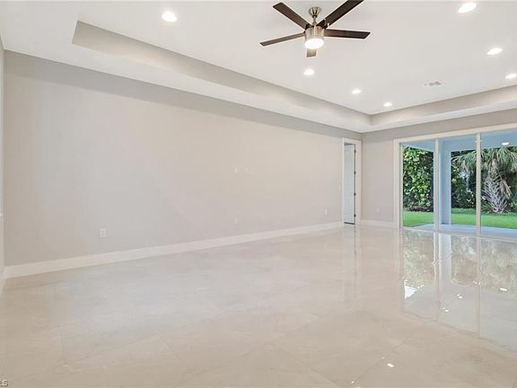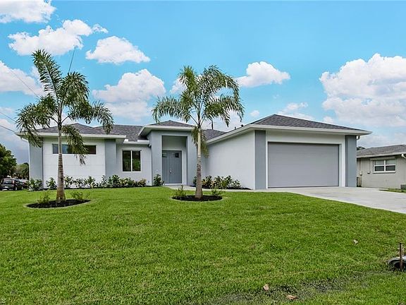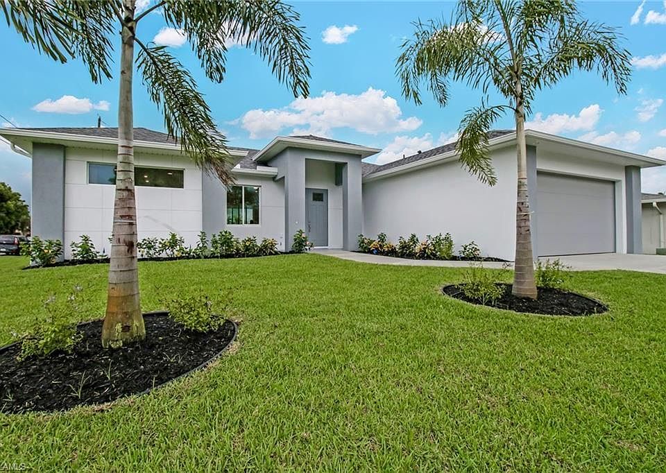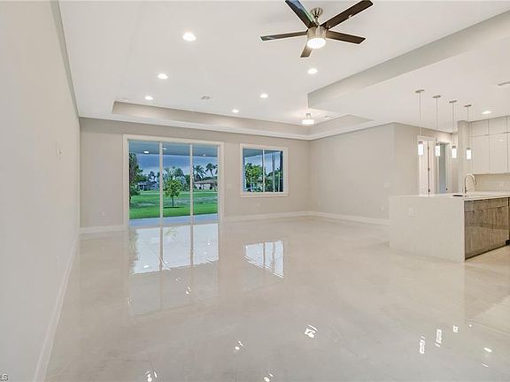 Brand new construction ready for new owners! This stunning double door entry way leads to a beautiful three bedroom, two bath, two car garage home that was just completed, totaling 1856 square feet. 24x48 Porcelain Tile throughout entire home including bathrooms. Main living areas have 10'4" ceilings with 9'4" throughout the rest of the home. The kitchen is a dream for anyone who enjoys cooking and hanging out with family. Quartz waterfall bar countertops throughout including bathrooms and laundry room, and a quartz back splash that runs the entire length of kitchen. Pull out trash and recycling bins. This home was made with steal beams, concrete walls and includes a concrete ceiling on lanai, along with concrete walkway around 3/4 of the home. There is upgraded lighting and recessed lighting throughout. All doors inside and out are 8' and the garage door is a soft close impact door that can be operated by an app. There is also a keypad outside the garage door for quick access.