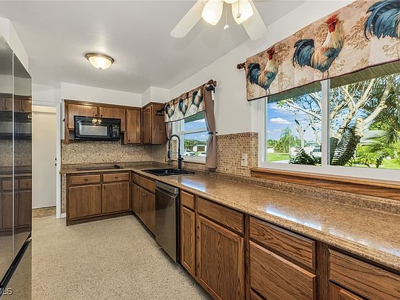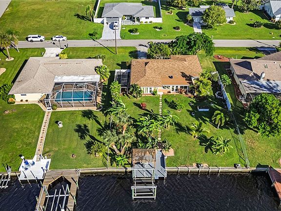 Welcome to your waterfront paradise on the 200’-wide Rubicon Canal! This 3-bedroom, 2-bath Gulf access home sits on an oversized .3-acre lot just one bridge to open water and offers the perfect mix of Old-Florida charm and essential modern updates. Most important updates include: a new roof (2023), HVAC (2024), gutters, attic insulation, water heater, and several impact windows. Enjoy Florida living year-round with a new gazebo overlooking the large intersecting waterways, paver walkways and lush landscaping around the dock. Not to mention the beautiful and bountiful fruit trees like banana, sugar apple, and raised garden beds ready for your herbs or flowers. With a backyard this big, you could put a large pool and spa with water features and a large wrap around pool deck and cage and STILL have plenty of yard left over. The 10K-lb boat lift and cement dock make it easy to hop on the boat for a sunset cruise, while the fenced yard provides privacy and space for kids or pets to play. Step inside to find natural light-filled living spaces, a spacious Florida Room that opens up to breathtaking canal views, and a layout designed to bring the outdoors in. Inside you'll find a newer refrigerator, dishwasher, garbage disposal, and washing machine. The large primary suite includes a walk-in closet and 2 sliding doors to your outdoor oasis. Tucked in a quiet yet convenient neighborhood close to dining, shopping, and the Cape Coral Yacht Club area, this home delivers the best of Southwest Florida waterfront living.