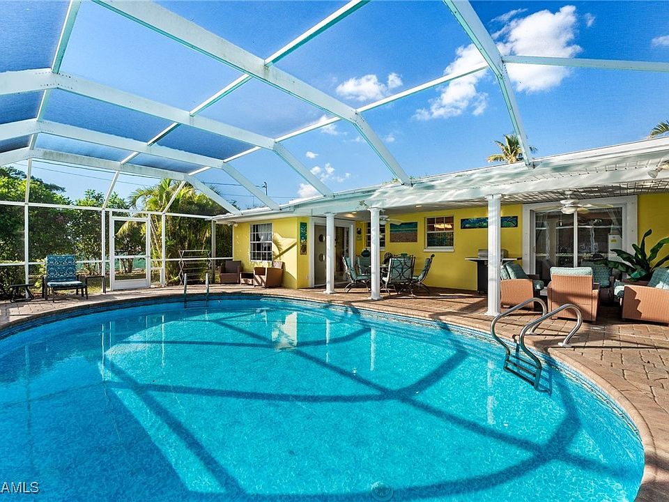 HUGE PRICE DROP ** Far BELOW market value ** Discover this charming poolside TURNKEY oasis in the highly sought-after Yacht Club area, aptly named “Paradise Nest” ** CHECKOUT THE VIRTUAL TOUR OR REQUEST IT ** This exceptional property offers so much more space inside than you’d ever imagine! ** Meticulously maintained and lovingly cared for, this home exudes a clean and inviting atmosphere, making it truly special ** Not just a tropical retreat with a breezy, lush backyard, it’s also a successful vacation rental—showings are by appointment only due to its nearly constant bookings *** Reservations can be transferred to the new owner or canceled upon request ** Best of all, this property is being sold turnkey, with everything included. (Check out photos 25/26 showing all accessories and goodies coming with the house like kayak, bicycles, BBQ) ** “The Nest” has been tastefully remodeled and impeccably maintained, with no expense spared on high-quality materials ** From the custom cabinets and vanities to the granite countertops, tile, and wood flooring, every detail reflects thoughtful design ** The home underwent major updates in 2023 and 2024, including fresh interior and exterior paint, a new A/C,water heater, large stainless steel side-by-side refrigerator, dishwasher, and a Rainbird irrigation system—all just 1–2 years old. The roof has been replaced ca. 6 years ago ** The kitchen boasts elegant oak cabinets and exquisite level 3 granite countertops, complete with a breakfast bar that’s perfect for cooking or entertaining ** Throughout the home, you’ll find luxurious finishes that elevate each space ** Step outside and experience your own private paradise *** Surrounded by mature landscaping, the backyard is a lush, tranquil escape featuring a preferred southern-exposure paved patio and large pool (17.5' x 28') ), enclosed in a screened cage for year-round enjoyment ** The lanai and pool area offer the perfect setting for outdoor gatherings or quiet relaxation, enhanced by tropical palm trees and a resort-like ambiance ** Whether you’re looking for a first home, a vacation retreat, or a short-term rental investment, this property has it all ** It’s ideally located in one of Southwest Florida’s most desirable neighborhoods: The Yacht Club area in SE Cape Coral is renowned for its breathtaking waterfront views, direct access to the Caloosahatchee River and Gulf of Mexico, and proximity to Cape Coral Beach ** A short bike ride or drive will take you to the vibrant downtown area, featuring restaurants, shopping, healthcare, and banking ** You’ll also find he iconic Boat House restaurant (to be rebuilt), public beach, and the soon-to-be-completed Yacht Club nearby ** Don’t miss this incredible opportunity to own a slice of paradise! ** Whether you’re a savvy investor, seasonal visitor, or first-time homebuyer, this property is the perfect combination of luxury, functionality, and charm ** All assessments paid ** The owner will sell their SUV as well