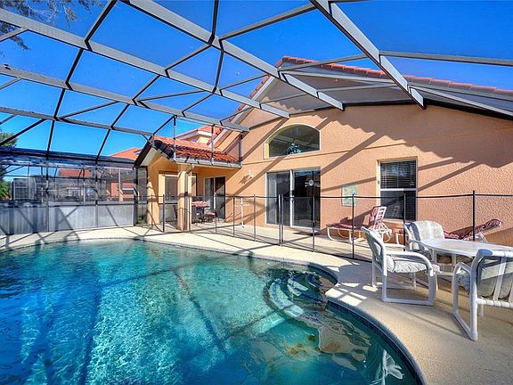 Gorgeous 4 bedroom 3 bath one story Mediterranean architecture style furnished pool home in the beautiful manned and gated community of Solana. Solana offers resort amenities. This spacious pool home is beautifully furnished and in "move in ready" condition for it new owner. Brand new luxury vinyl planking in ALL bedrooms and the dining area, high ceilings, lots of light, and a games room for you or your guests enjoyment. This property has no rear neighbors and the pool is South facing! Solana offers a large clubhouse with a fitness center, business center, ping pong, pool table, arcade, a large community pool spa, miniature golf, Tiki Bar, playground with slide, and a manned guard at the gate. This property is ideal for primary resident or a 2nd home that is zoned for short term rental. Solana is conveniently located to Disney and other theme parks, shopping, medical care, restaurants, and Hwy #27 and I-4.