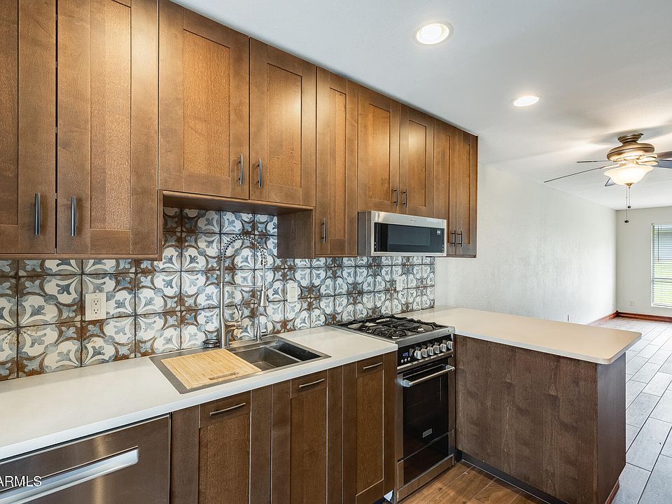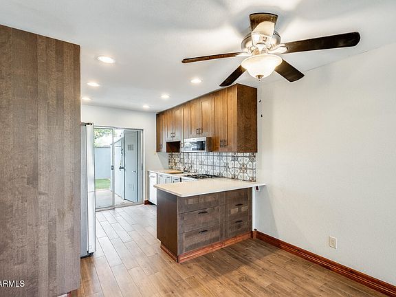 Charming Condo! This 2 bedroom, 2 bath ground-level, single-story condo offers modern updates & a convenient location in central Phoenix. Inside, you'll find wood-like tile floors throughout & fresh paint. The kitchen is a standout with stainless steel appliances, quartz countertops, a stylish tile backsplash, floor-to-ceiling cabinetry & sliding door that opens to the backyard. Both bedrooms include ceiling fans, while the bathrooms have been updated—one featuring a walk-in tiled shower. The private backyard offers a covered patio & grassy area, perfect for relaxing outdoors. Enjoy community amenities including grassy open spaces & an outdoor pool. Ideally situated near the 51 freeway & the Phoenix Mountain Preserve, with shopping, dining, & recreation just minutes away.