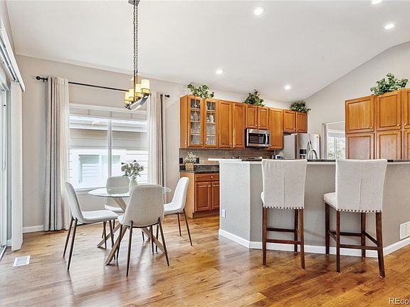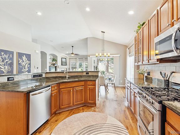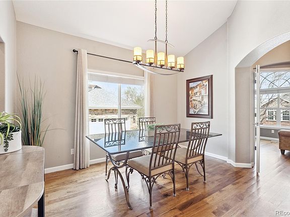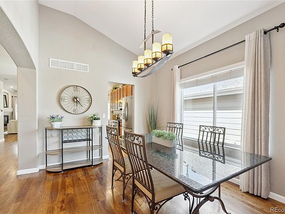 Step inside to warm hickory hardwood floors that lead to the beautifully designed kitchen, featuring striking granite countertops, extended-height cabinets, and a sleek slate tile backsplash. The gas stove makes meal prep a breeze, while the large wall pantry and convenient pull-out drawers ensure effortless organization. The counter-height island is great for informal meals and extra prep space. Dimmable under-cabinet lighting adds ambiance, perfect for entertaining in the spacious living and dining rooms, complete with surround sound and a cozy gas fireplace. The primary suite is a true retreat, boasting a fully remodeled five-piece bath with granite countertops, and a luxurious tiled shower with a frameless glass enclosure. The main level also includes two additional bedrooms (or use one as a den/office), an additional bathroom with updated fixtures, and a laundry closet. The unfinished basement features five egress windows and rough-in plumbing for a bathroom, offering limitless potential for customization and future living space. Step outside to a beautifully Xeriscaped backyard, complete with high-quality pet-friendly turf, a Trex deck, and an extended concrete patio —ideal for outdoor enjoyment. Additional features include an oversized 2-car garage with an epoxy-coated floor, service door, LED lighting, and extra attic insulation for energy efficiency. Special features include: NEWER furnace & A/C, attached flat screen TVs in office and on the patio are included, curtains are included, high-impact roof shingles, radon system in place, Ring doorbell and Nest Thermostat (controlled from your phone) is included. Nestled in the sought-after Saddle Rock golf community, this low-maintenance home offers a peaceful setting with access to a pool, clubhouse, walking trails, and convenient proximity to shopping, dining, and recreation. Easy access to E-470 makes commuting a breeze. Don't miss the opportunity to make this stunning home yours!