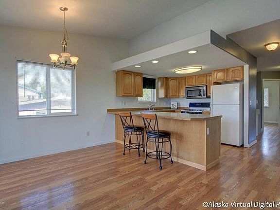 Open concept kitchen, dining and living area with high ceilings, gas fireplace and lots of light! Laminate flooring through-out! 2 bedrooms up with full bath & 1 oversize bedroom downstairs with full bath & laundry. Large fully fenced backyard & storage shed. Double car garage, room for RV/Boat parking and more! Must see! Located conveniently off Lake Otis, close to UMED district & shopping.