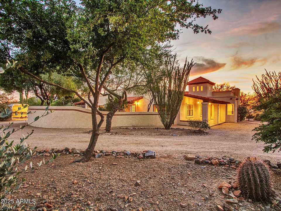 Set on 2.5 acres in Cave Creek, this Santa Fe-inspired residence combines classic architecture with modern efficiencies, including Tesla solar panels. Interior appointments feature vaulted, beam-accented ceilings, Saltillo tile flooring, and multiple fireplaces. A separate guest house (approx. 757 sq ft; buyer to verify) provides versatility for guests or ancillary use. Outdoor living is defined by expansive desert vistas, mature saguaros, a ramada, and multiple patios for entertaining. Proximity to trail access will appeal to equestrian enthusiasts. A compelling synthesis of character, function, and an authentic Arizona setting. Disclosure: Renderings are AI-generated for visualization purposes only and were not completed by a licensed contractor. Please consult a licensed contractor/engineer regarding load-bearing elements and feasibility.