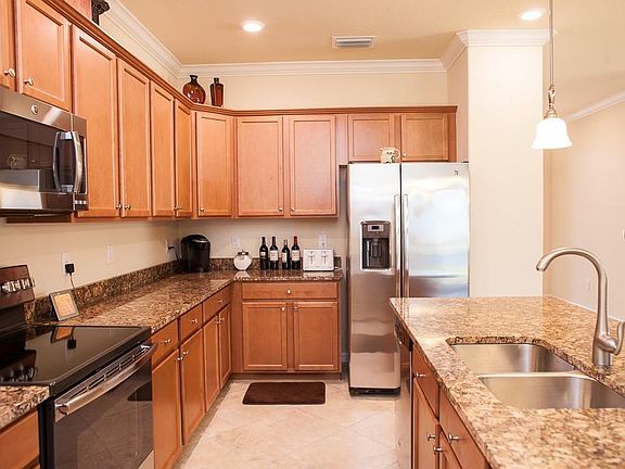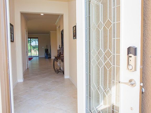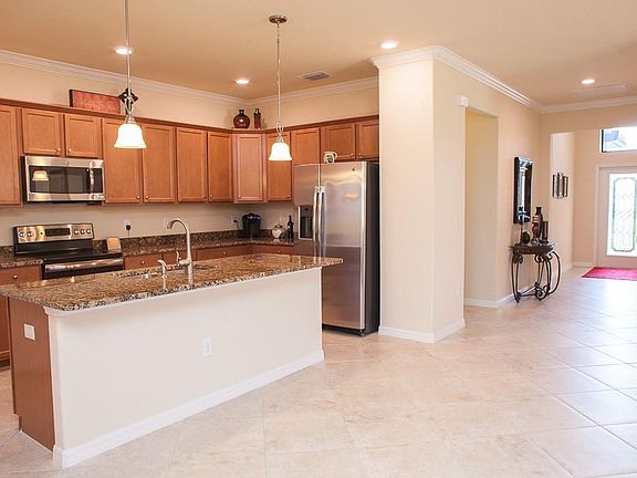 Enjoy all the Florida lifestyle has to offer from this "like-new" Trevi model, built by Lennar, is nestled on a private cul-de-sac with a huge side yard and water and preserve views. A brick paver driveway, tile roof, decorative glass front door and tropical landscaping accent the front exterior of the home. The bright interior features an open layout with crown molding and easy to care for tile flooring throughout the main living areas. The large gathering room has glass sliding doors leading to an extended covered and screened lanai with pavers - the perfect spot to enjoy nature and serene water views,. The spacious dining room is adjacent to the kitchen complete with granite counter tops, a granite floating island with sink, stainless steel appliances and a walk-in pantry. The master bedroom features water views, two walk-in closets, and an en-suite bath with a dual sink vanity, garden tub and glass enclosed shower. The 3 additional bedrooms and 2 baths are spacious and perfect for family or guests. They also offer the flexibility of a home office, playroom and more! All yard and landscape maintenance plus basic cable is included in HOA fees. As a Social Member, your quarterly club dues include the use of two fitness centers; multiple heated swimming pools, including two resort style pools; a tiki bar; 9 Har-tru tennis courts with leagues; pickleball courts; a community room; pool table & library room, 2 restaurants & year-round scheduled activities. Available turn key furnished on separate contract.