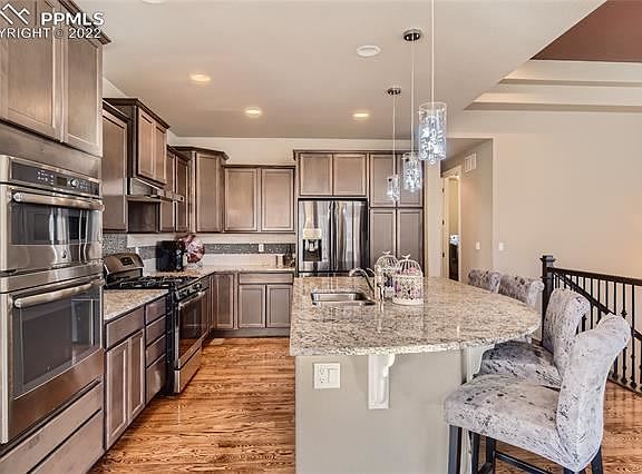 Stunning Banning Lewis Ranch home with high-end upgrades! Open floorplan with gorgeous wood floors throughout the family room, dining room and the kitchen! The chef's kitchen features granite countertops, upgraded cabinetry and modern stainless steel appliances! Gas range with 2 convection ovens! Gas fireplace with striking natural stone surround! Vaulted ceilings! Master bedroom features a large gorgeous walk-in shower! 2nd bedroom on the main level could easily be used as an office! Fully finished basement featuring 2 additional bedrooms, full bath, and spacious family room. Private covered patio and maintenance free turf in backyard! Oversized 2.5 Car Garage! One of the most desirable communities with quick access to trails, parks, recreation center and award-winning schools. Welcome to the Banning Lewis Ranch lifestyle!