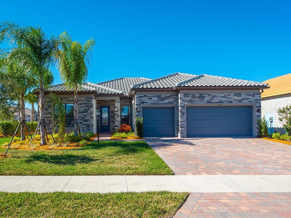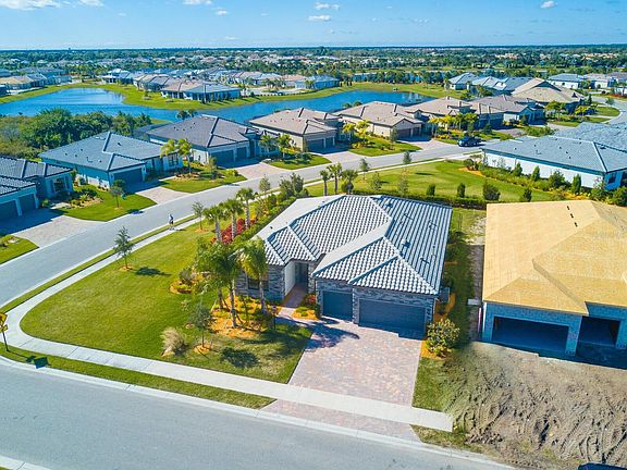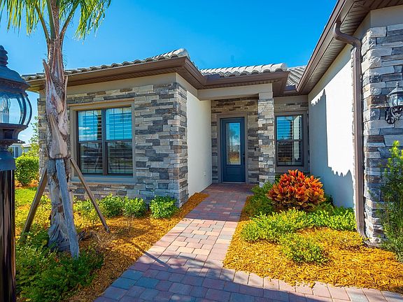 Built in 2020, this Stellar floor plan home with separated 3 bedrooms, 3 bathrooms, home office and 3 car garage is located in the over 55 Del Webb community in Lakewood Ranch. Situated on a corner, premium lot with a landscaped easement means only one neighbor. Over $115,000 in upgrades such as luxury vinyl flooring, 8-foot interior doors, crown molding and hurricane impact glass windows which are in every room of the house. Any chef would be delighted with the kitchen that has a center island, walk-in pantry with built-ins, Kitchen Aid appliances, Ocean Jasper Quartz counters, wood cabinetry, gas cook top with wood canopy hood, beverage center plus undercabinet lighting. Corner sliding impact glass doors in the Great and dining rooms open to the screened, paver lanai with pre-plumbed summer kitchen and fenced backyard. The home was built in compliance with the Florida Green Building Coalition standards and is also a Smart Home with CAT6 outlet, keyless entry, Smart garage door opener, thermometer, and door lock. You aren't just buying a home, you are buying into a resort-style community with an incredible amenity center and impressive list of recreational opportunities...tennis, pickle ball, bocce ball, spa, outdoor bar, full restaurant, state-of-the art fitness center, resort-style pool with lap and an abundance of social activities. Your new lifestyle awaits you.