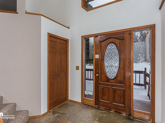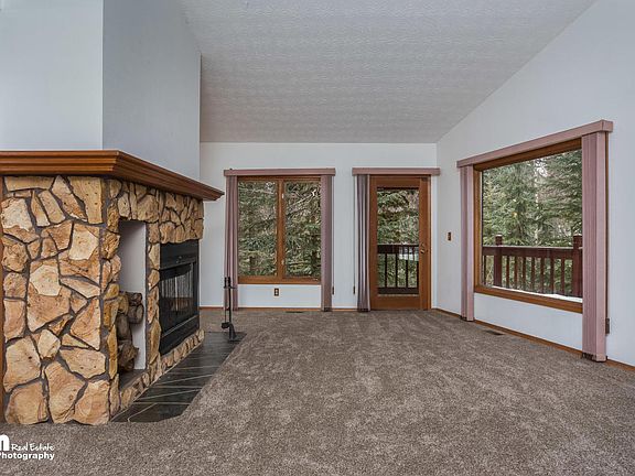 Tucked away & surrounded by nature! This lower hillside home sits on a spacious lot. LR w/FP & access to back deck. Lg open kit w/SS appliance, island brkfst bar w/prep sink & Jenn Aire cook top, skylight & wood flooring. MBR w/vaulted ceiling & private balcony. MBA w/dble sinks, jetted tub & shower. FR, lg laundry rm, extra storage & new carpet thru-out! Close to Chugach Park & Hilltop Ski area!