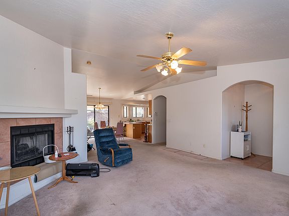 Great opportunity to own a home in one of Prescott Valley's best neighborhoods with a move in ready price. Low maintenance landscaping and a 3 car garage invite you into the open concept living room with great natural light from the bay window and a desirable wood burning fireplace. The dining room has sliding glass door access to the large private backyard with covered patio space and is separated from the kitchen with a nice sized eat in counter which wraps around the room. Accented with three individual functioning windows and a large pantry this kitchen is bright and functional. The floor plan includes two guest rooms and a full bath in addition to the Master Suite with lighted double vanity, walk in closet and full bathroom accommodations.