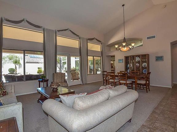 Enjoy Resort-Style Living! Newly painted Exterior! Great Curb appeal! Large lot!Dramatic High ceilings, Light and Bright! Open floor plan in the formal and casual living areas. Split master with sitting area & ensuite bath featuring a garden tub, walk-in shower, double sinks and walk-in closet. Guest wing is split on East side of the home. Eat-in kitchen with a large island & great storage is open to the family room, perfect for entertaining. Custom paint, plantation shutters,wood blinds & drapes. The backyard & sparkling pool is an oasis, surrounded by lush AZ landscape & a grassy yard. The large covered patio offers an outdoor room. Great location, minutes from upscale shopping/dining and convenient to Loop 101.