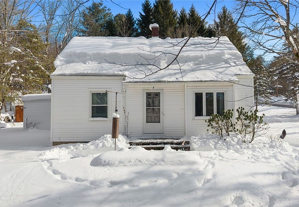 Welcome home to this charming 4 bedroom 1 bath Cape Cod set on a picturesque, tree-lined lot of over 2.5 wooded acres, that offers privacy and a serene natural setting. Take a walk along the land and see the nearby meandering brook and enjoy the backyard privacy. Step inside to a bright and open living room that flows seamlessly into the eat-in kitchen, complete with appliances. Two first-floor bedrooms and a full bath provide the convenience of easy one-level living if you want , while providing the flexibility for up to four bedrooms if desired with two on the second floor. Additional features include a concrete driveway, a 1.5-car garage, and a storage shed—perfect for tools, equipment, or hobbies. The full basement offers added storage and includes a laundry area. The second floor presents an excellent opportunity to add a half bath, enhancing functionality and value. Updates such as vinyl siding and thermopane windows make this home low-maintenance and easy to enjoy. A wonderful opportunity.