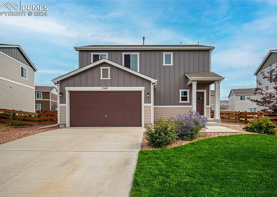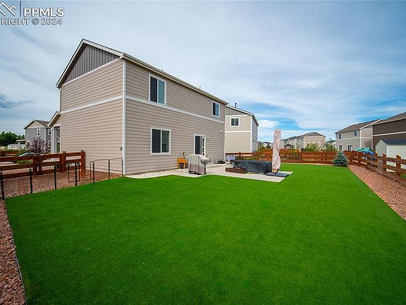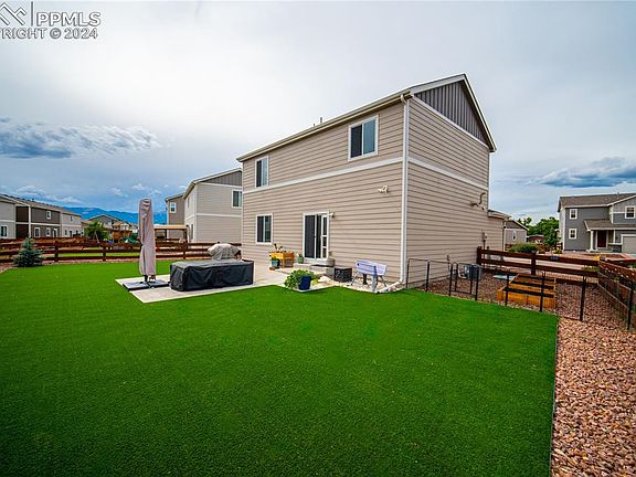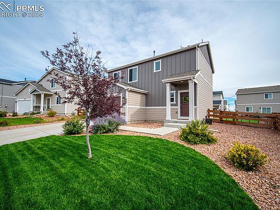 This stunning 3-bedroom, 2.5-bath home, complete with a 2-car garage, offers a blend of modern upgrades and thoughtful design. Step inside to an open concept main level with beautifully appointed kitchen featuring 42" cabinets and a gas stove as well as an included refrigerator. Right off the main level, the outdoor space is an entertainer’s dream, boasting a custom oversized concrete patio and a massive amount of artificial turf in the backyard, making it both stylish and low-maintenance. And yes, there’s A/C to keep you cool during those warm summer months. Retreat upstairs to the large master bedroom with its own ensuite bathroom and a walk-in closet that offers plenty of storage space. Your two secondary bedrooms and their bathrooms are upstairs as well. The home is located in a great neighborhood with easy access to everything you need – from tons of new stores and restaurants to Peterson and Schriever Air Force Bases. Plus, it’s only 15 minutes to Ft. Carson! With great views of Pikes Peak and quick access to Hwy-24, Powers, and Marksheffel Roads, this home combines the best of convenience and comfort. It's easy to view, so set up an appointment today and make this your new home!