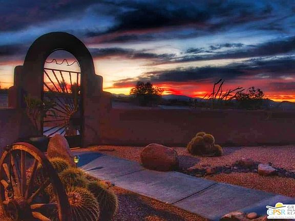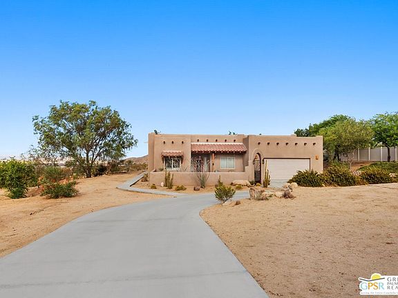This beautifully cared for Santa Fe style home, blends seamlessly into the landscape of the Mojave basin. Sitting on just over an acre, right in the heart of Joshua Tree, this treasure features both front and backyard walled in courtyards that look out onto panoramic views. The back patio, especially, will become your new favorite place with its breathtaking sunrises. The landscaping boasts of mature trees and desert scape that has an irrigation system. And as if that was not enough, solar has been installed as well!! So, if you're looking for a vacation home in Joshua Tree that is licensed, furnished (minus a few personal items to be listed at time of escrow) and turnkey ready, this is it!! Come and see for yourself, how you can make this jewel your home away from home. Solar will be paid off at close of escrow.