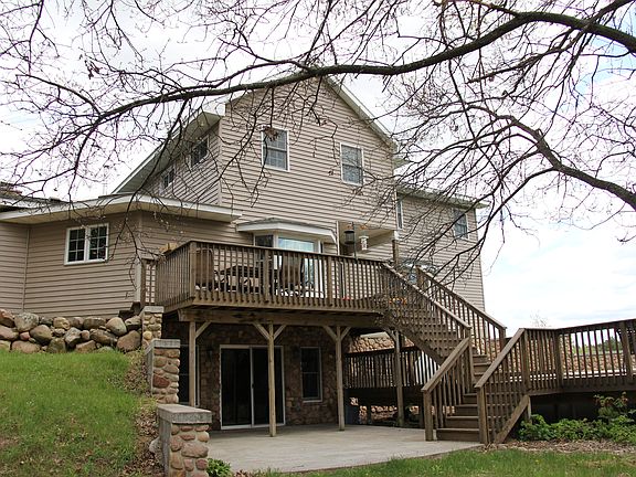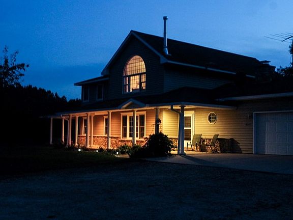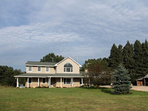 Secluded country living, 10 minutes from town! This two-story custom-designed, 5br, 3.5 bath home is set back on 25 beautiful, rolling acres; 10 minutes from Plover and 20 minutes from Waupaca just south of Hwy 54. Great room boasts hardwood oak flooring, living room with free standing wood stove, room for a large dining table, and a second sitting area near a bay window that overlooks the wooded backyard. Kitchen opens to great room and includes a massive pantry, skylight and large built-in cutting board. Oversized mudroom with built-in lockers and cabinets throughout is adjacent to kitchen and 3 car garage. Master bedroom on main level (wood floors) includes master bath and connecting bedroom/nursery with wood floors and second bay window. Upstairs you will find 2 large bedrooms, one bathroom, a large office with massive arched window (see first picture in front of house), and a large family room. Basement is essentially a separate three-room, 1 bath apartment with addl kitchen, laundry, living room with fireplace and separate entrance from the garage (and walkout slider). Beautiful stone and brick work on the exterior and interior. Outdoor- the front porch wraps around the side and includes a door from the master bedroom, and the back includes a massive deck and 30' above-ground pool that can host a wonderful pool party for the whole gang. Property includes a 45'x98' pole building with cement floor and 4 overhead doors and enclosed shop area- the envy of the neighborhood. Owners are eager to find the right family to enjoy this wonderful home and property; Your whole family (and mother-in-law) can enjoy this home with room to spare. (Additional acreage available - asking price for house with 40 acres $449,000. )