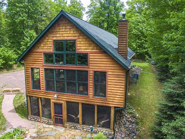 FIRST TIME ON THE MARKET: Incredible private retreat located just minutes from snowmobile, bike trails and downtown Manitowish Waters. Located on the main level is the Great room with impressive fieldstone wood burning stove, hickory wood floors, tongue and groove knotty pine ceiling, and granite countertops in kitchen and main bath, small den, master bedroom suite with built in desk, three season room with electric heat and a large walk in closet. There is a large loft bunk room and the 3rd bedroom is in the lower level along with a large family room, gas fireplace, queen size murphy bed, full bath with jetted tub, large cedar sauna to warm up in on cool nights. Large screen porch with brick floor, two large level flag stone patio's one with big fire pit, a natural gathering area for family & friends. Walking to the lake is a play area. Hiawatha lake is quiet private lake with no public access. There is a large 2 1/2 car detached garage with car port and a large wood shed.