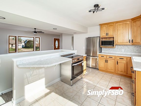 Welcome to this charming ranch-style home featuring 2 bedrooms, 1 bathroom, and an attached one-car garage. Step inside to an inviting open floor plan that seamlessly connects the living room, kitchen, and dining area. The living room, hallway, and bedrooms boast beautiful hardwood flooring, adding warmth and character throughout. The kitchen offers ample cabinet space, tile flooring, a breakfast bar, and stainless steel appliances. The updated bathroom includes a new vanity, toilet, luxury vinyl plank flooring, and a generously sized shower. Downstairs, you’ll find a clean, waterproofed basement with reinforced walls—an ideal blank slate for your personal touch. Outside, enjoy the large backyard with convenient alley access, perfect for outdoor activities or additional possibilities.