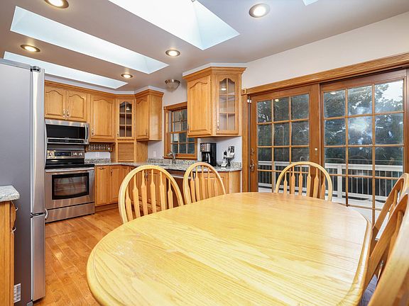 Freshly painted interior. Oak doors, cabinets, trim throughout home with upstairs oak flooring. Laminate flooring in lower level. Both upper and lower bathrooms with walk-in porcelain tiled showers, floors with whirlpool tub in lower level bath. Granite countertops in kitchen and bathrooms. Built-in window seats with storage in upper bedroom, living room and in upper bath with cabinetry surrounding a natural stone gas fireplace in family room. Natural light throughout home with skylights in entryway, kitchen and upper bathroom.