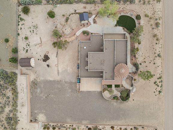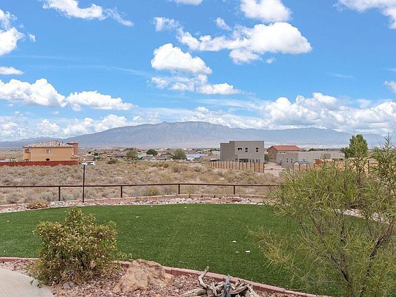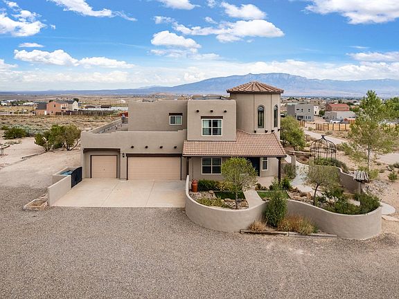 $15,000 seller concessions!! Pueblo style custom home situated perfectly on 0.92 acres to have unobstructed VIEWS of the Sandia Mountains! This 4/3.5 bath property features an open floor plan with high ceilings, natural lighting, and a floor-plan to accommodate everyones needs. The large kitchen overlooks the spacious living room where you can cozy up to the kiva fireplace and the elegant dining area for entertaining with built-in buffet cabinet. The expansive primary suite offers a sitting area as well as a large ensuite featuring a garden tub, separate shower, and plenty of counter space. Up the spiraling staircase find serenity in the perfectly sized bedrooms, loft with wet bar, and balcony out to views. The private LARGE estate is fenced with iron posts! Space for Rv & Toys!!