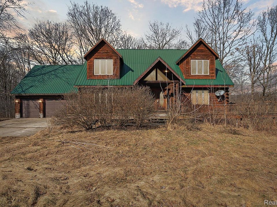 Exciting Opportunity. Modern Large 2 story metal roofed log style home (sold as-is) on 32 wooded acres in Oceola township.