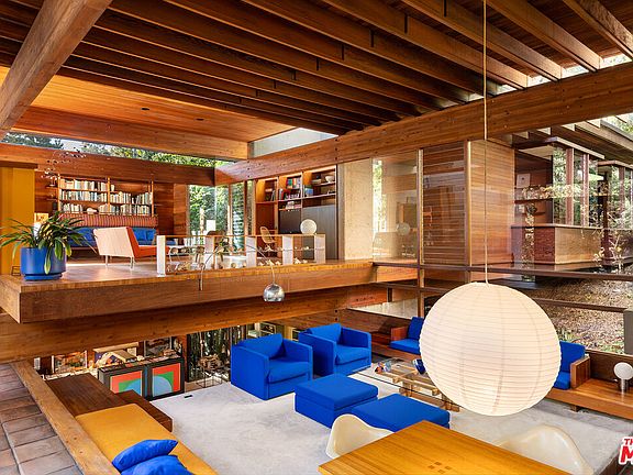The Kappe Residence, Ray Kappe, FAIA is a quintessential Mid Century Modern Masterpiece, and personal residence of architect / educator Ray Kappe. Floating above it's hillside terrain, natural landscape is allowed to flow undisturbed beneath its strong framework, representing a marriage between pure structural logic and lyrical sculptural design. Beautiful redwood ceilings and redwood detailing combined with walls of glass and massive skylights create a continuous symphony of direct, indirect and dappled light that animates the house from sunrise to sunset. Considered a work that is disciplined and deliberate, yet seemingly free and effortless, the 5 bedroom, 5 bath structure is described as both " essay and poem", Traditional spatial boundries are erased by seven split levels encompassing 4,157 square feet. Described by the L.A. Times as " The Greatest house in Southern California", designated as a Cultural Historical Monument in 1996, the residence represents a master class in the "additive process of design", embracing the surrounding landscape of Rustic Canyon. The primary suite anchors the northeast wing, while a suite of 3 bedrooms occupies the southwest wing, providing a balance between communal and private life. Below the main living area lies a glass walled studio with stunning views of the rock garden. The open living area has serene tree top views and custom designed Kappe furniture. Four unique outdoor spaces, including a dramatic cantilevered deck, create the perfect indoor- outdoor experience. There is a stunning lap pool, spa, sauna and cabana with additional kitchen and bath. The estate is a modern vessel for enduring legacy, a global icon of residential architecture that continues to be a mecca for scholars and admirers of iconic architecture worldwide. The distinguished provenance is deeply intertwined with Los Angeles history, as it functioned as Kappe's residence , office and creative studio, gestating the inspiration & design for over 200 of his projects. As the "birthplace" of SCI-Arc, it represents a singular opportunity for the stewardship of a national treasure. Shown to pre-qualified clients only.