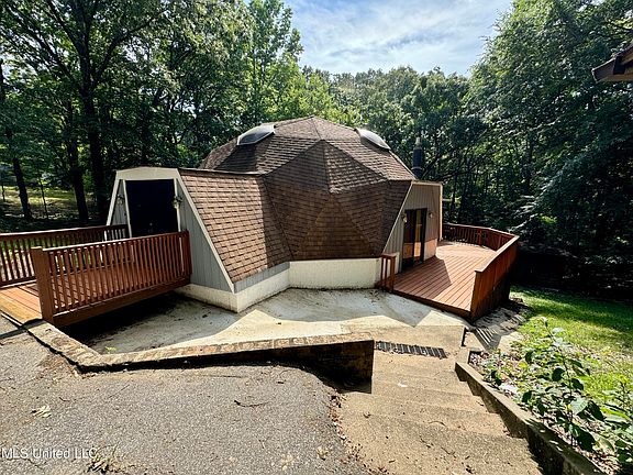Introducing a one of a kind lake house located at Enid Lake! This unique property features 4 bedrooms, and 3 bathrooms, and spans 3 stories, offering ample space for comfortable living. The amenities include an RV carport with hookup, a regular carport, and a shed all on 1.73+/- acres of land. Right from your very own back patio, you can watch an abundance of wildlife travel through your property. The remarkable DOME house design is complemented by a wrap-around porch and a finished basement with fresh red cedar siding and a jacuzzi tub. The lake house is located just walking distance from Chickasaw Hill boat ramp where you will find the public beach, picnic area, RV hookups, and a nice play area for the kids. Don't miss the opportunity to make this stunning property your new home!