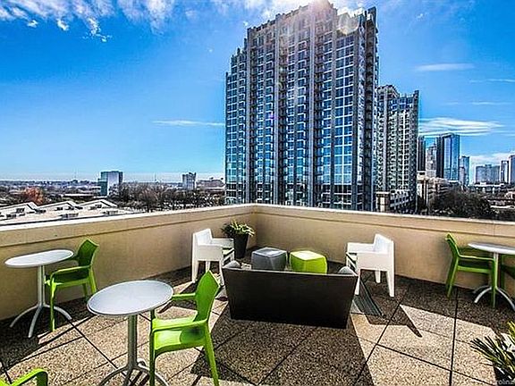 Corner unit with windows galore! Second floor studio condo with city views, custom built-in cabinets, vaulted ceilings, stained concrete floors. Rooftop terrace with grill, secure parking garage, swimming pool, walk to your everything uptown! $1600/mo rental potential