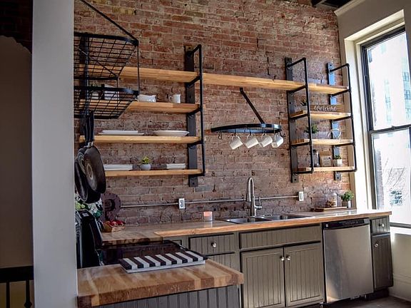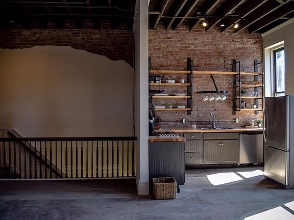 The Red Light Gallery building is a mixed-use, traditional storefront building in downtown Atchison, Kansas. The ground floor is a retail and special event space and the second floor houses two loft-style apartments with 12 ft. ceilings, exposed rafters, brick accent walls, custom built butcher block countertops, and original wood trim and flooring from the 1890's. The design concept for this project fuses the historic character of the building with modern finishes and conveniences, including in-unit laundry, stainless steel appliances, and subway tile throughout the bathrooms and kitchens. Owner pays for water, tenant pays for electricity and internet. There is no gas service. There are no pets allowed and no smoking.