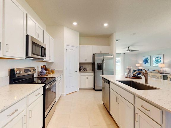 Move In Ready!! This single-story home showcases a contemporary open design among kitchen, dining room and Great Room to promote seamless everyday living. Kitchen features Grey Shaker style cabinet and All main living areas feature LVP ''Wood Plank'' Flooring w/ tile in wet areas. Large Covered Back Porch for entertaining on warm Florida evenings. IMPACT WINDOWS, 2'' Faux white blinds as well as Refrigerator and Washer and Dryer makes this the perfect move in ready home!!! Call today and ask about our Builder Incentives!!!!